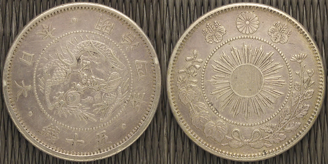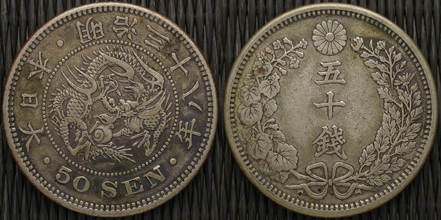 旭日竜50銭銀貨は大きく分けて3種類が発行されており、いずれも銀の重さに変わりはありませんが初期型は直径が32.12mmでしたが厚さが薄かったため、明治4年銘の後期型は直径が30.909mmに縮小され厚みが増しました。