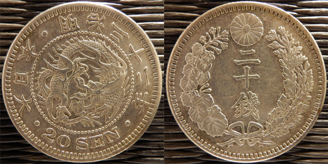 Obverse:明治六年-明治三十八年 · 大日本 · 20 SEN ·
